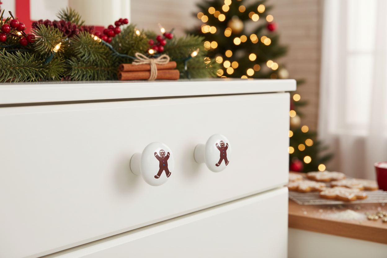 These Gingerbread Man Ceramic Drawer Knobs add a perfect designer touch for Decorating for Christmas or the Holidays. These drawer pulls, can be used for cabinets, Dressers, furniture knobs, end tables, nightstands, or for the Kitchen Cabinet Knobs, bathroom and just about anything you can think of that needs a drawer knob or handle to pull it open. These Gingerbread Christmas Drawer Knobs are sure to compliment any Christmas Holiday Decor.