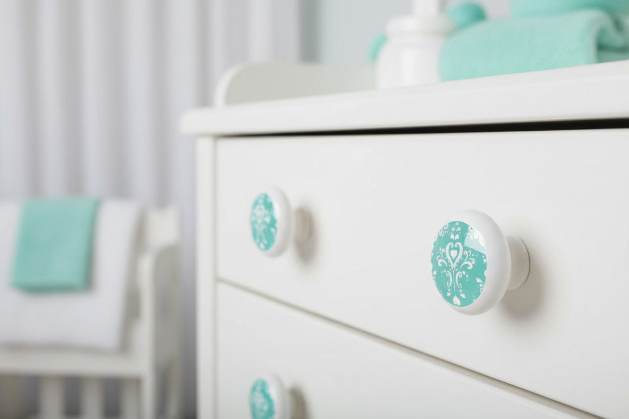 These Aqua Heart Damask Print Ceramic Drawer Knobs add a perfect designer touch for Children's dresser drawer pulls, cabinet drawer pulls, furniture knobs, nursery changing tables, children's toy box handles, bathroom and just about anything you can think of that needs a drawer knob or handle to pull it open. These Blue Green Drawer Knobs are sure to compliment any Frozen / Princess inspired Nursery.