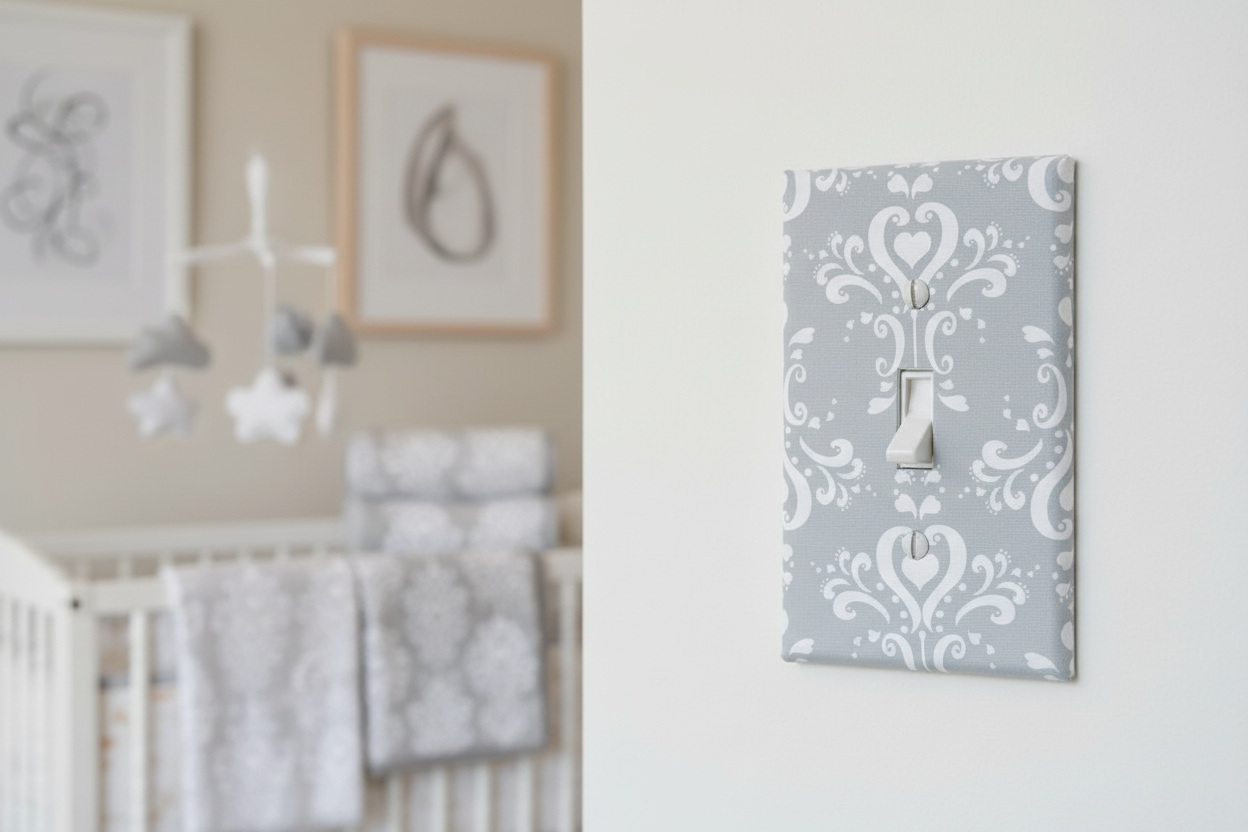 Add some color to your children's room décor with Presto Changos easy to use and Grey Light Switch Covers. Our Outlet Covers are a fabric / canvas wrapped for a designer look that is sure to compliment any Nursery Room Decor or Children's Wall Décor.