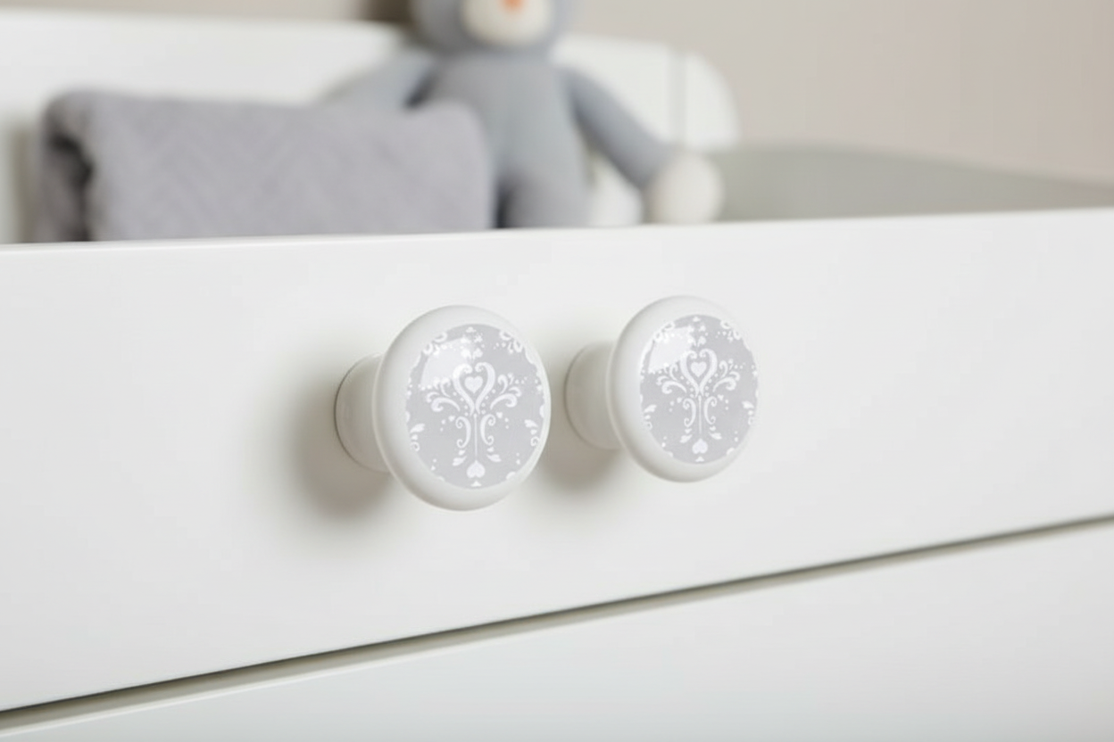 - Two Grey and White Damask Print Drawer Knob Pulls Designed to fit any Themed Nursery for Baby Girls or Boys