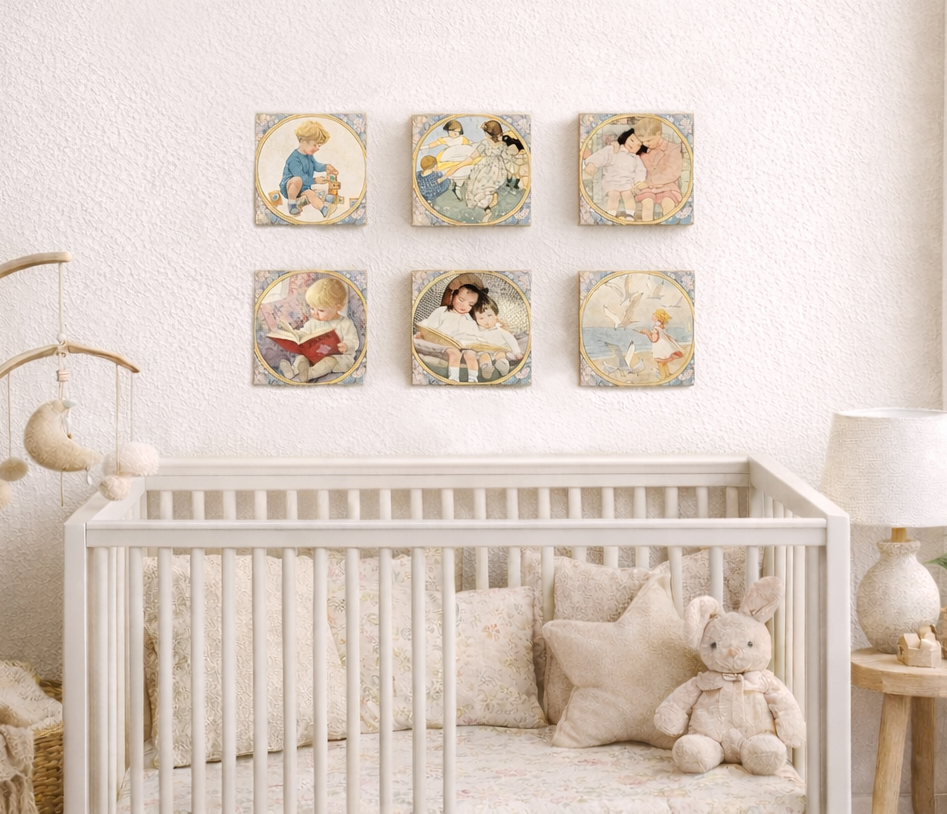 Mix & Match Collection: Choose from 6 different vintage designs including Boy in Blue Playing with Blocks, Child Reading a Book, Children on a Chair, Children in a Hammock, Girl with Seagulls, and Children Playing Ring Around the Rosy. Mix and match to create your perfect collection.