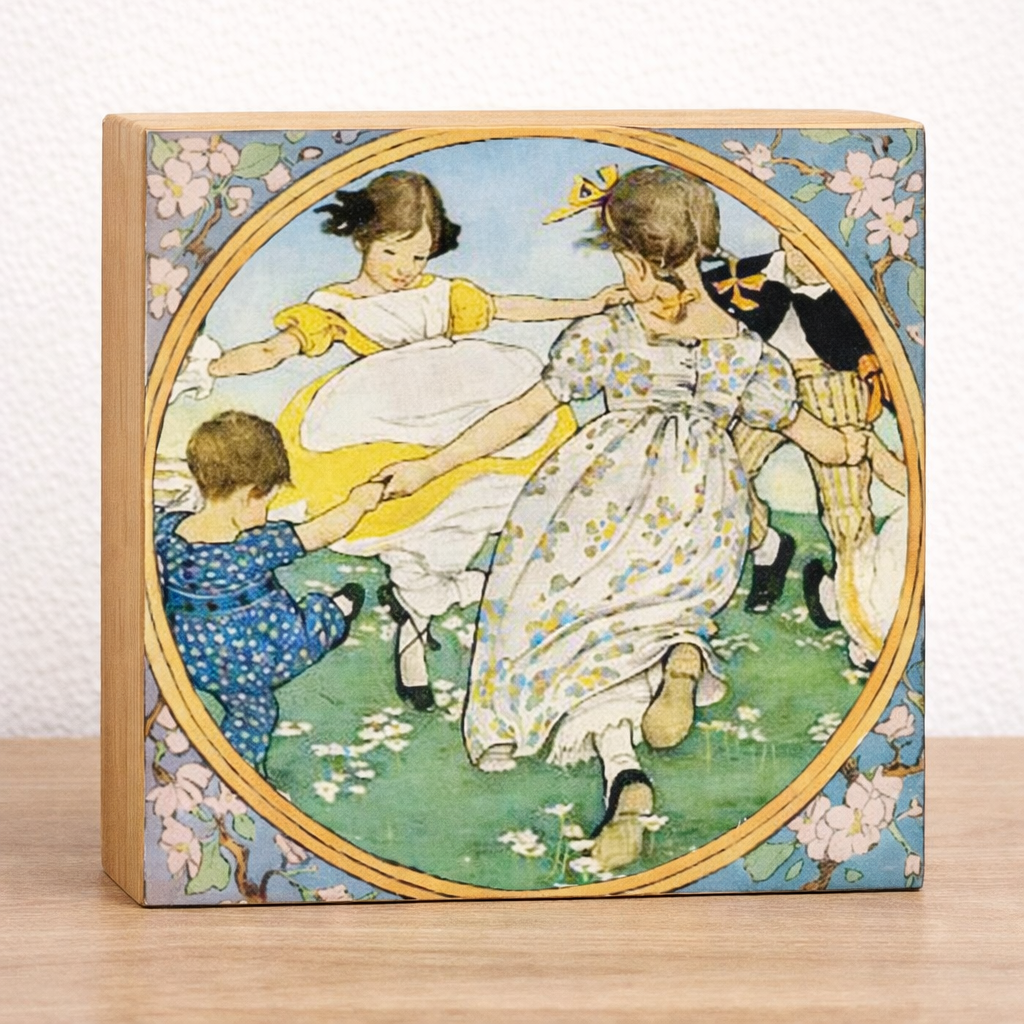 About the Artwork: Features vintage children's illustrations by Jessie Willcox Smith, a renowned children's book illustrator from the late 1800s. These charming, grandmillennial-style images are printed directly onto distressed wood blocks with a durable, scratch-resistant finish built to last for years.